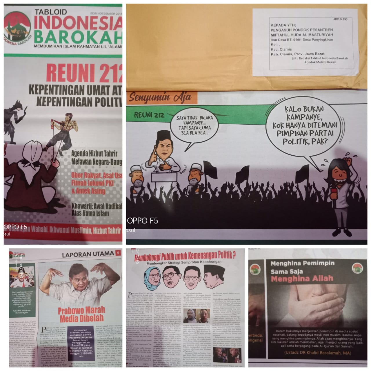 Tabloid 'Indonesia Barokah' sendiri berisi rangkuman berita yang menyudutkan pasangan Paslon nomor urut 022 pada Pemilu 2019, Prabowo Subianto-Sandiaga Uno.